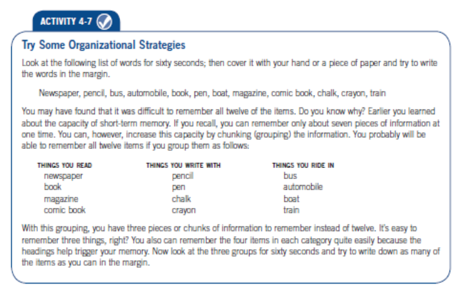 6. Organizational strategies – Organize the materials for example computer are divide into three part which are input, output, storage.